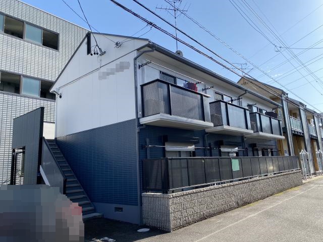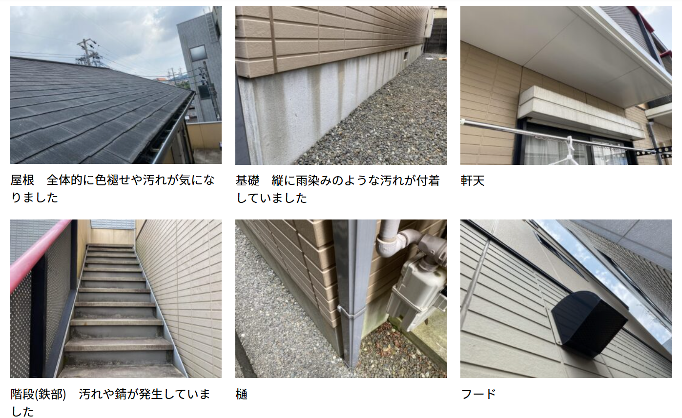 外壁全体にチョーキングやカビが発生し、防水機能の低下が懸念されていました。また、単調な外観デザインで、近隣物件との差別化が難しいことにもお悩みでした。屋根の色褪せや階段鉄部の錆も、建物の古さを強調してしまっている状態でした。