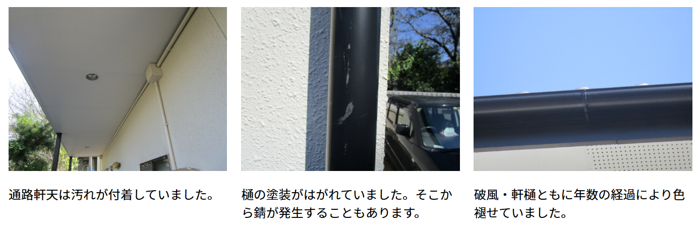 築年数の経過と共に、建物全体が日焼けしたように色褪せ、古びた印象になってしまっていることがお悩みでした。特に屋根の汚れや、共用通路床の目地シーリングの劣化が進行しており、美観だけでなく、建物の防水性や耐久性の低下もご心配されていました。