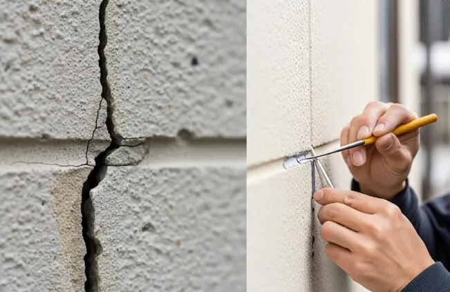 アパート外壁のひび割れ(クラック)と、職人がUカット・シーリング充填で丁寧に補修している様子の比較