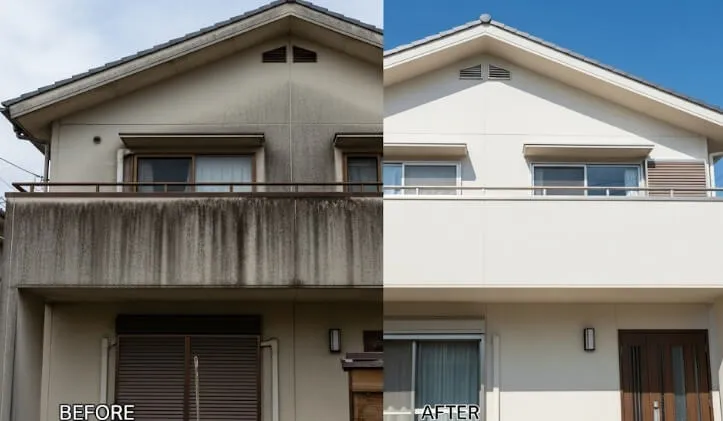 外壁に深く根を張ったカビやコケは、強力な水圧をかけただけでは表面が削ぎ落とされるだけで、菌糸(根)が下地内部に残ってしまいます。その上から新しい塗装を施すと、残った菌が新しい塗料の樹脂成分を栄養源として内部で再繁殖し、結果として塗装後わずか数年で塗膜が内側から膨れたり、剥がれたりする「早期劣化」の最大の原因となるのです。