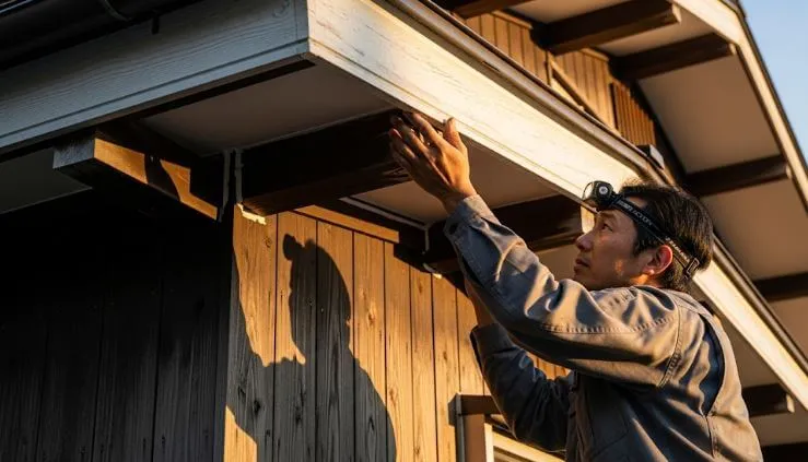 横殴りの雨や、外壁を伝ってきた雨水が、この隙間から壁の内部へと侵入する可能性があります。軒天周辺は、屋根からの雨水の影響を受けやすい場所であり、一度雨水が侵入すると、軒天自体のシミや剥がれ、さらには壁内部の腐食に繋がるケースも少なくありません。