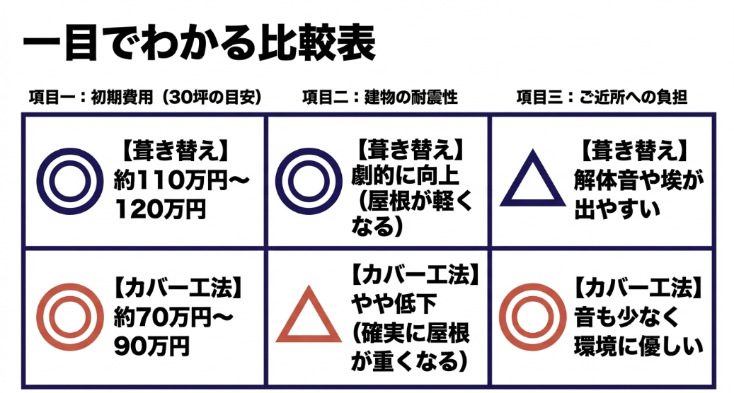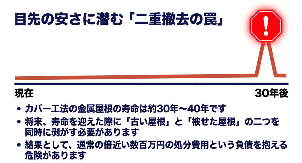 目先の安さだけで判断せず、将来カバー工法の屋根を改修する際の「二重撤去費用」のリスクを必ず考慮しましょう。