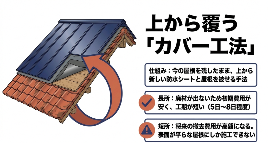 今の屋根を残したまま上から新しい防水シートと屋根を被せる手法で、初期費用が安く工期が短いが将来の撤去費用が高額になる