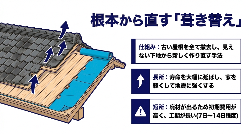 古い屋根を全て撤去し見えない下地から新しく作り直す手法で、寿命を延ばすが初期費用が高く工期が長い