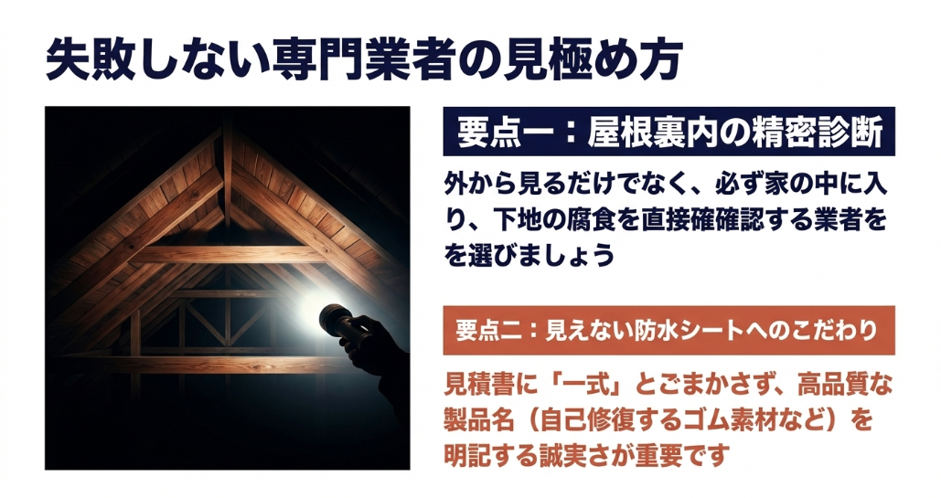 見えない屋根裏診断を徹底し、防水シート(ルーフィング)の品質にまでこだわる優良業者を選ぶことが最大の防衛策です。