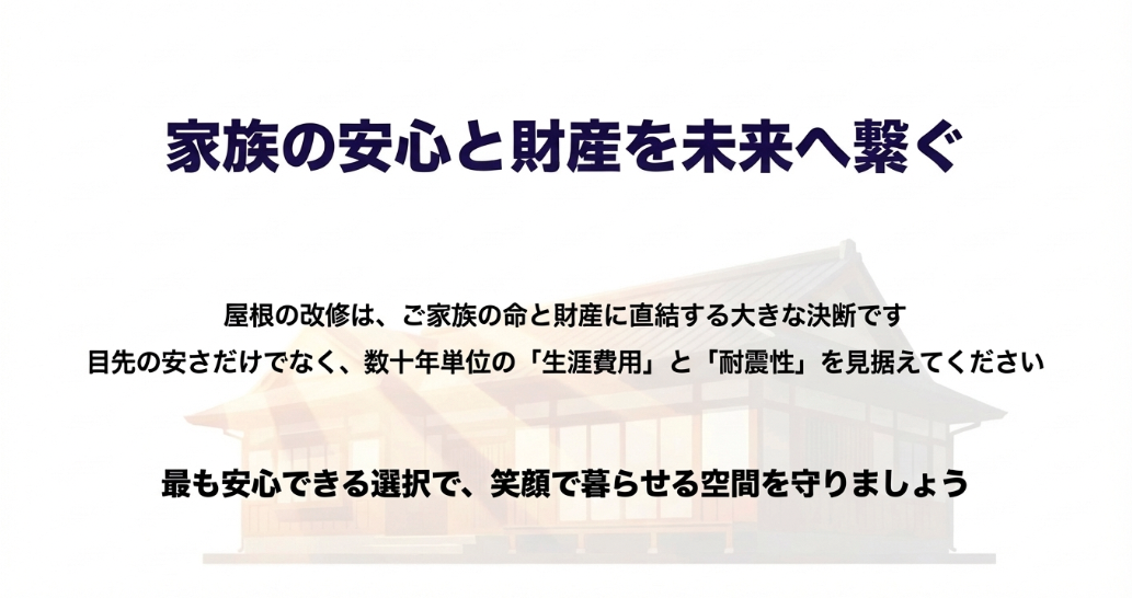 屋根改修は家族の命と財産に直結する大きな決断であり、生涯費用と耐震性を見据えて安心できる選択を促すメッセージ