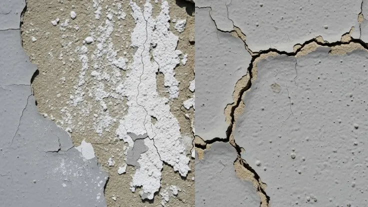 - ひび割れ(クラック):幅0.3mm以上のひび割れは、毛細管現象で雨水を吸い上げてしまう危険なサインです。放置すると建物の内部に水が浸入し、構造体を傷める原因となります。