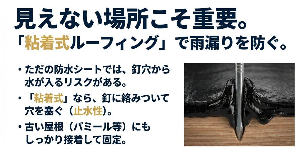 粘着式のルーフィングであれば、既存屋根にピタリと接着するため、強風で剥がれる心配がなく、釘やビスを打ち込んだ際も、その粘着層が釘周りに絡みついて穴を塞ぐ「止水性」を発揮し、漏水リスクを最小限に抑えることができます。