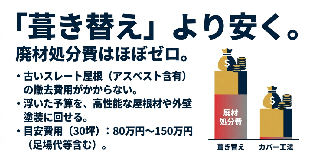 経済性:アスベスト処分の高額費用をカットできるため、葺き替え工事よりも圧倒的に低コスト。