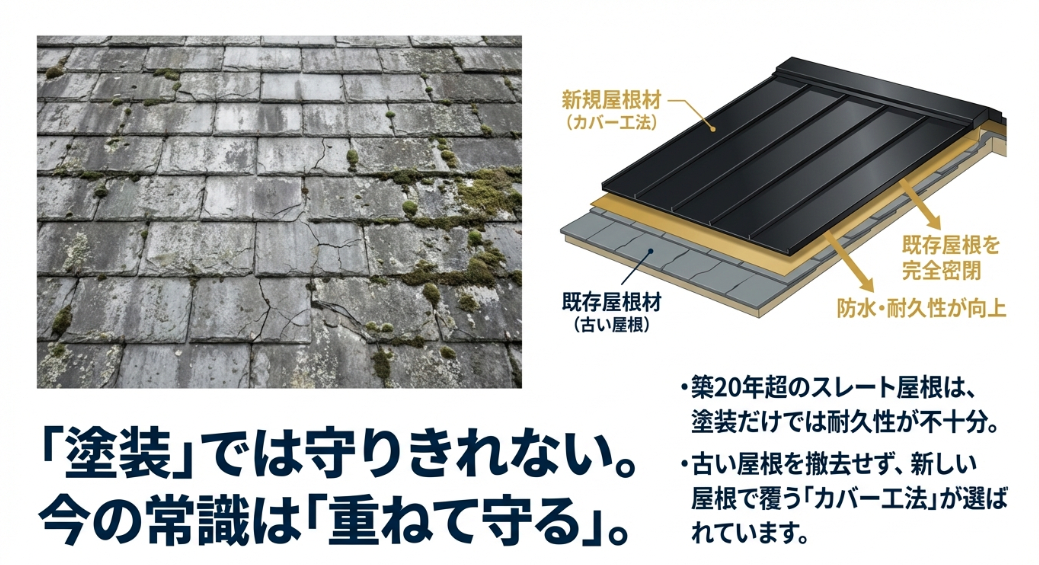 しかし、築20年以上でスレートの劣化(ひび割れ、剥離)が進行していたり、今後その家に30年以上住み続ける予定であれば、塗装を繰り返すよりも耐久性が高く、将来的なコストが安い「カバー工法」が圧倒的におすすめです。