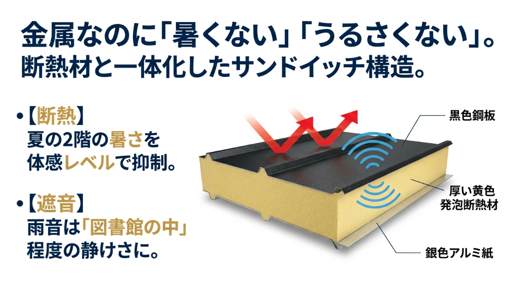 快適性:断熱材一体型のサンドイッチ構造で、夏場の暑さと雨音を劇的に軽減。
