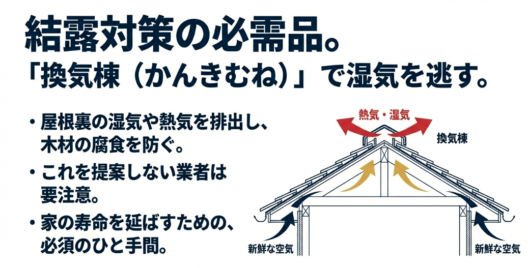 これを防ぐためには、屋根の頂点部分に「換気棟(かんきむね)」を設置し、小屋裏の湿気や熱気を外部に排出する「空気の通り道」を確保することが不可欠です。