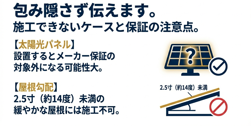 太陽光パネル設置時のメーカー保証対象外リスクと、2.5寸未満の緩勾配屋根への施工不可に関する警告