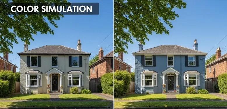 実際の家の写真を使った外壁塗装のカラーシミュレーション。「ビフォー」と「アフター」で色の変化がわかる