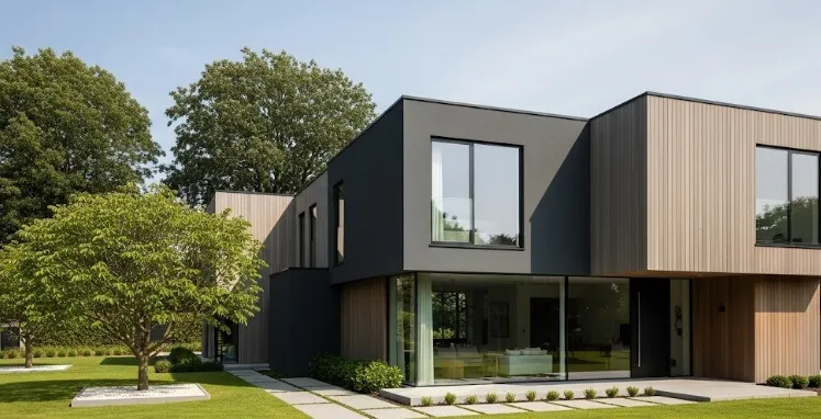マットなチャコールグレーの塗装と木目調サイディングを組み合わせた、シックでモダンな住宅の外観