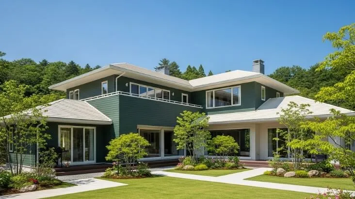 静岡の緑豊かな景観に調和する、ダークグリーンの外壁とアイボリーの屋根を持つ住宅