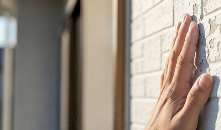 外壁のチョーキング現象を示すクローズアップ写真。手のひらや指に白い粉が付着しているのがわかる