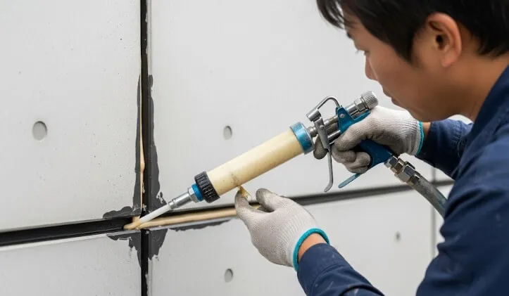 ヘーベルハウスのALCパネル間のシーリング工事の様子。職人が専用のガンを使って、新しいシーリング材を丁寧に充填している