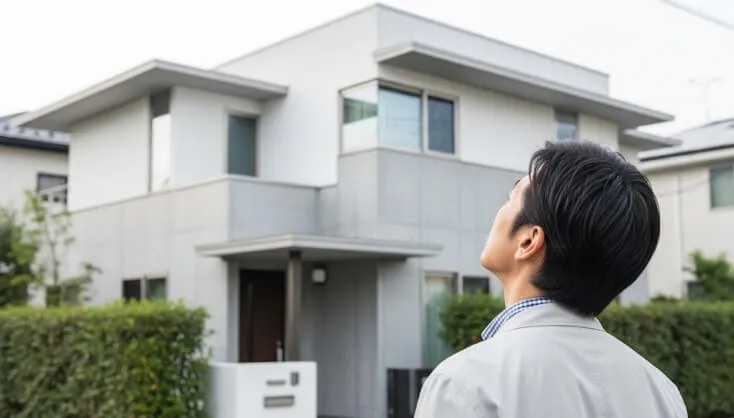 自宅であるモダンなヘーベルハウスを見上げ、メンテナンスについて思いを馳せる人物の後ろ姿