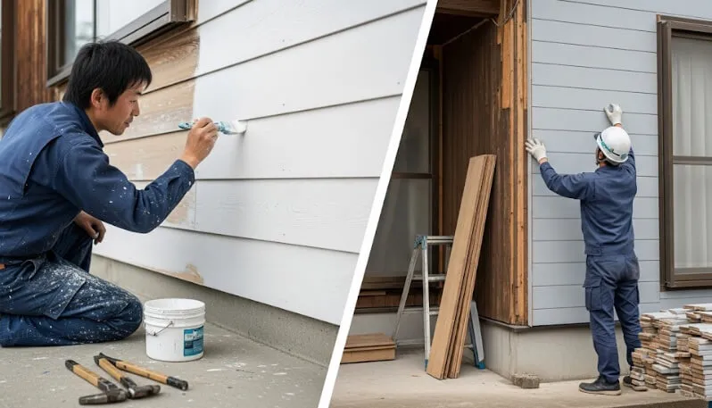 選択の決め手は「既存の外壁材の劣化状況」です。 外壁材自体に反りや大きなひび割れ、剥がれといった深刻なダメージがなく、表面の塗膜の劣化が主な問題であれば、「外壁塗装」で十分対応可能です。