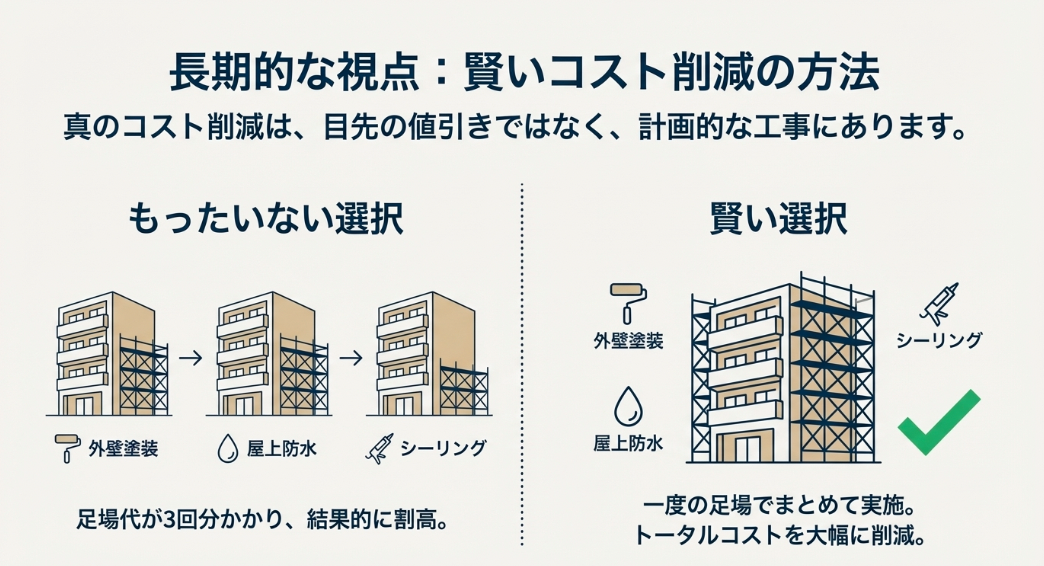 安易なコストカットは、将来的な修繕費用の増大を招く可能性があることを念頭に置いておく必要があります。