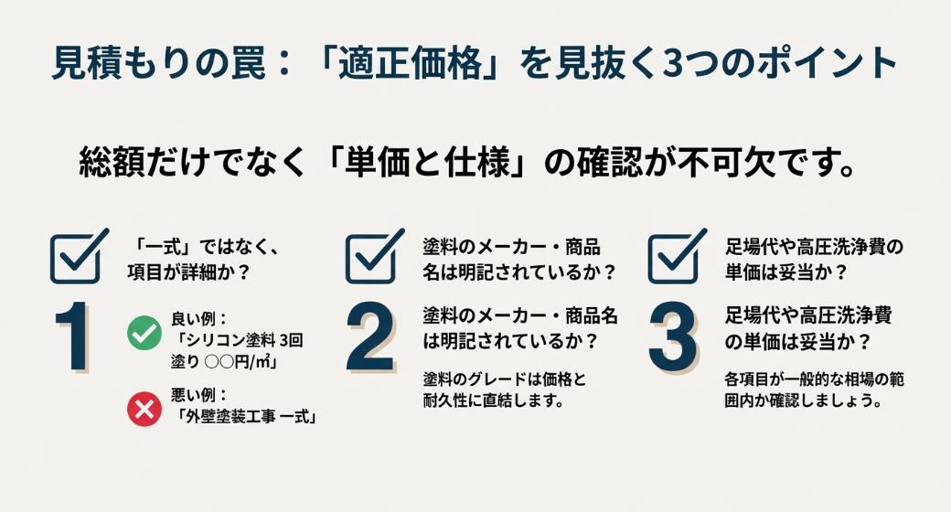 見積もりの項目が「一式」ばかりになっていないか、塗料のメーカー名と商品名が明記されているか、そして足場代や洗浄費が適正な単価で計上されているかを必ず確認しましょう。