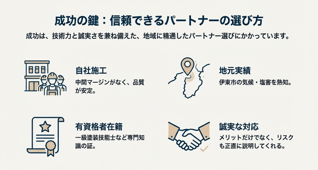 また、伊東市や静岡県東部での施工実績が豊富で、塩害対策の知識を持っていることも重要です。