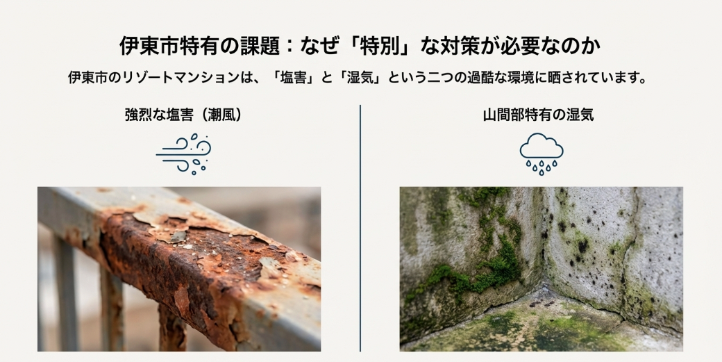 伊東市のリゾートマンションが抱える最大の問題は、その恵まれた立地ゆえの過酷な自然環境です。