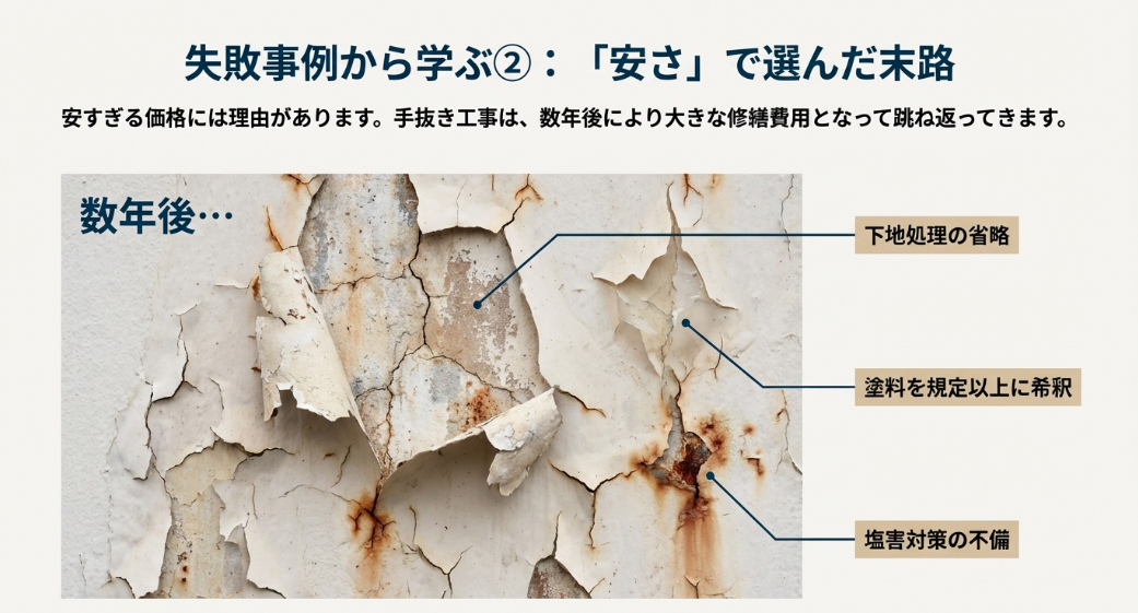 安易な業者選びや塗料選定は、「安物買いの銭失い」になるだけでなく、資産価値の低下を招くリスクさえあります。