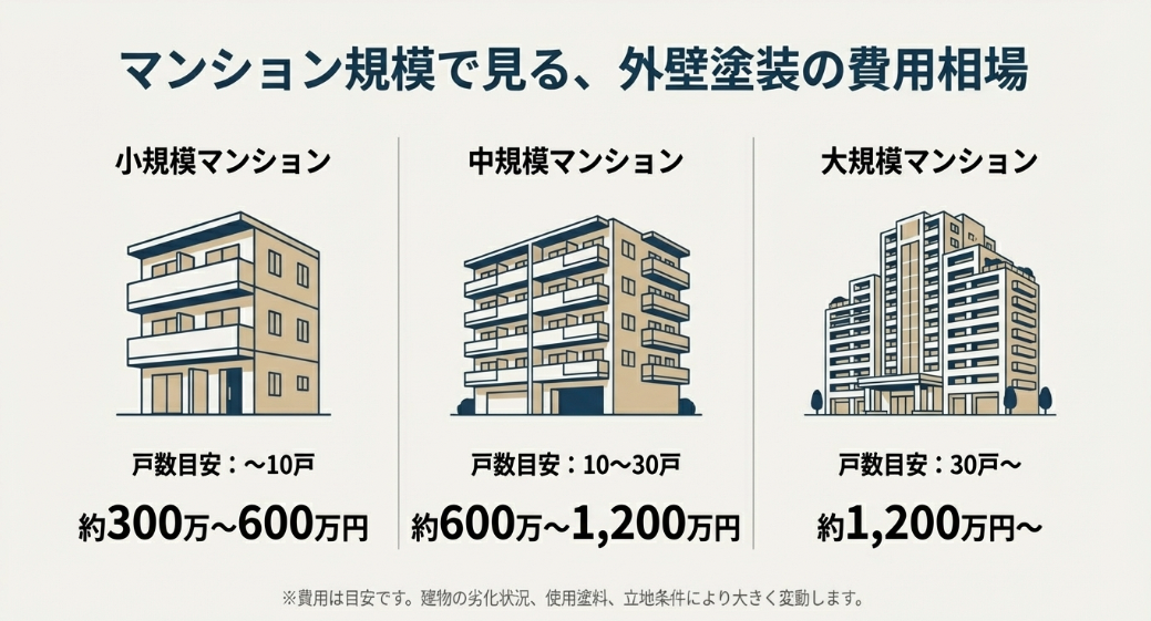 | マンション規模 | 戸数目安 | 費用相場(概算) | 備考 |