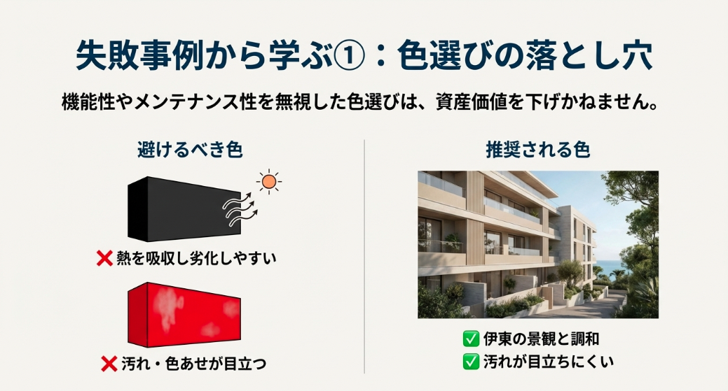 リゾートマンションの塗り替えにおいて、デザイン性は重要ですが、メンテナンスの観点から外壁の色でやめたほうがいい色が存在します。