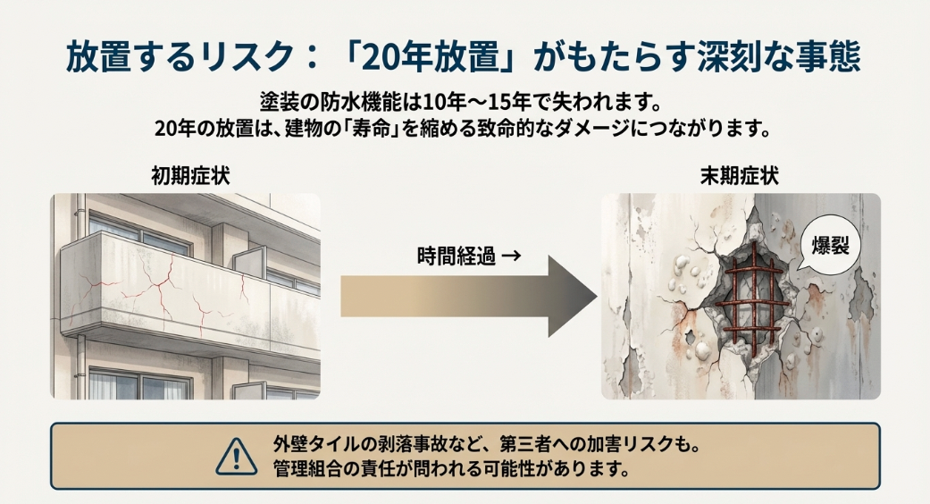 20年間メンテナンスを行わずに放置すると、雨水がコンクリート内部に浸透し、鉄筋のサビ(爆裂)やコンクリートの中性化を招きます。