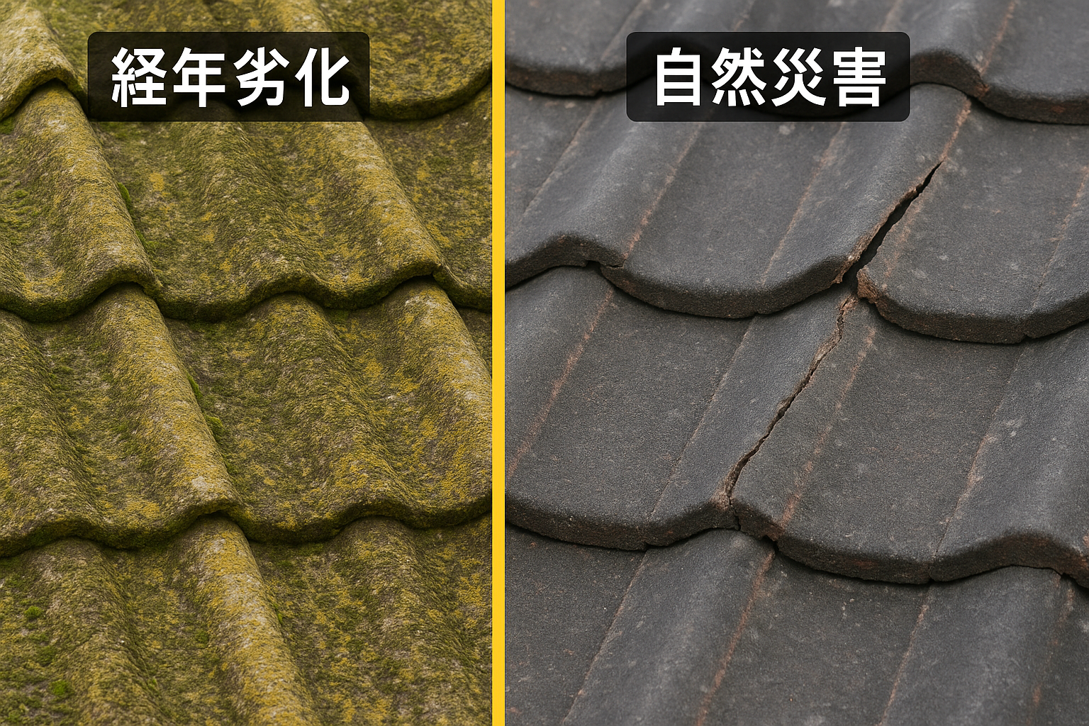経年劣化と自然災害による屋根の損傷を比較した画像。左はコケと色褪せ、右は台風で割れた屋根。