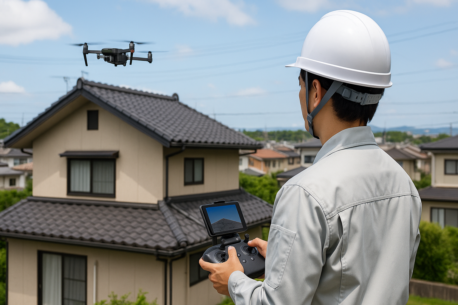 静岡の住宅街を背景に、専門家がドローンを操作して屋根の無料診断を行っている様子