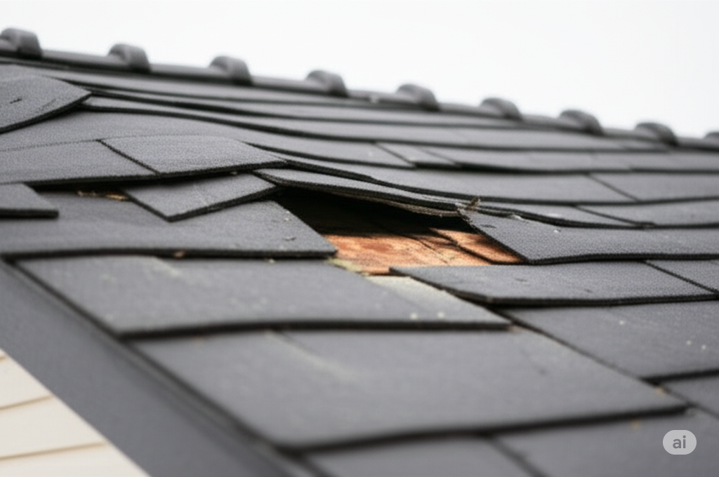 • ズレ・めくれ:屋根の一部だけ、瓦やスレートが明らかにズレている。屋根頂部の棟板金が、風の力でL字型にめくれ上がっている。