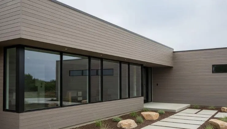 艶消しクリア塗装が施された、木目調のサイディングを持つモダンな住宅の外観。光の反射が抑えられ、上品で落ち着いた雰囲気を醸し出している