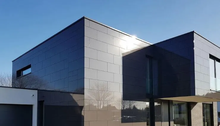 艶ありのクリア塗装で仕上げられた、タイル調のサイディングを持つ現代的な住宅。光を反射して輝き、新築のような高級感と清潔感が際立っている