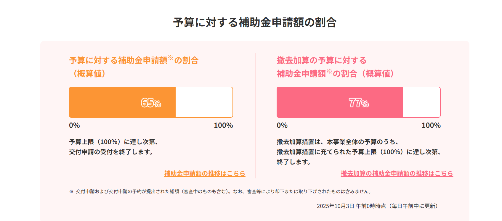 すでに予算の6割以上が申請されています。特に、既存の電気温水器を撤去する場合に補助額が上乗せされる「撤去加算」は、予算消化ペースがさらに速い状況です。給湯器交換が集中する10月以降の繁忙期には、申請が急増することが予想されるため、お早めのご相談をおすすめします。