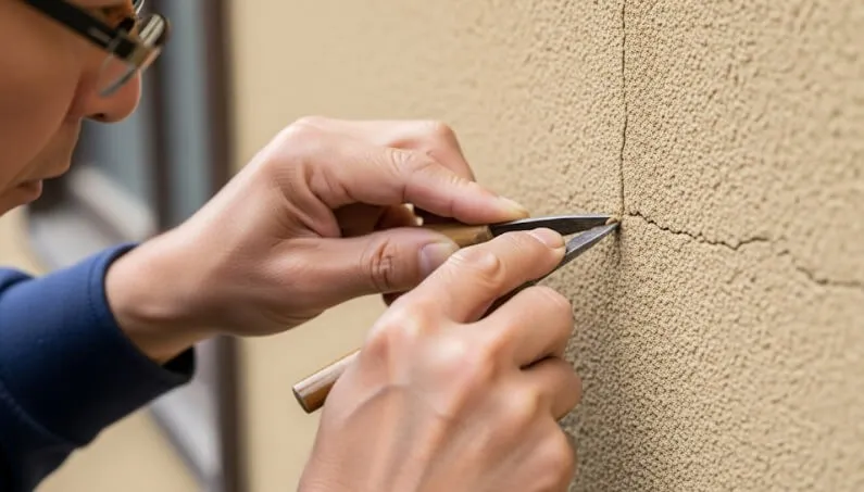 - ひび割れ(クラック):塗膜や外壁材自体にひびが入っている状態。幅0.3mm以上のひび割れは、雨水が内部に浸入する危険信号です。