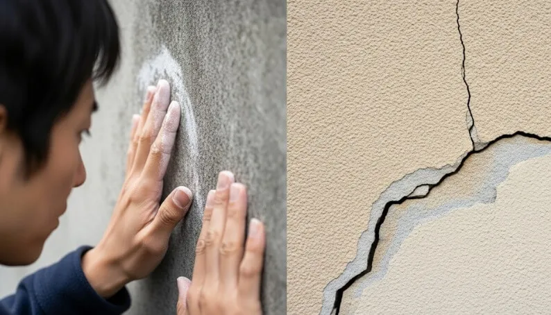- チョーキング現象:外壁を手でそっと撫でたとき、チョークのような白い粉が付着する状態。これは塗膜が紫外線で分解され、防水機能が失われ始めているサインです。
