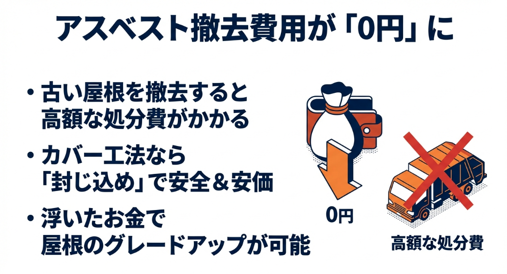 アスベスト対策としての経済的合理性:古いスレート屋根にカバー工法を採用することで、高額な撤去・処分費用を大幅にカットできます。