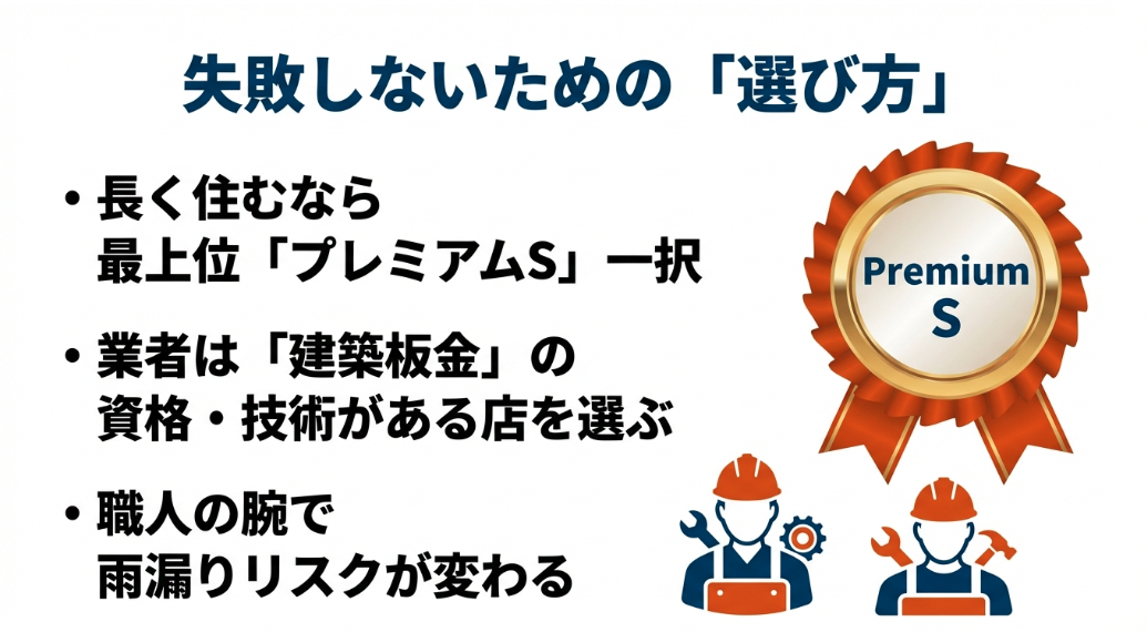 失敗しないために最上位のプレミアムSと技術のある業者を選ぶことを推奨するイラスト