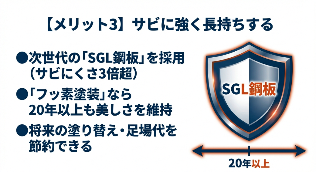 サビに強く20年以上長持ちする次世代のSGL鋼板を示すシールドのイラスト