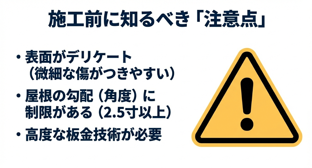 製品特性の正確な理解:表面のデリケートさや施工可能な屋根勾配の制限(2.5寸以上)など、事前に把握しておくべき注意点があります。