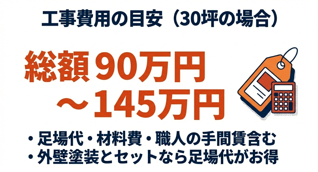 30坪の場合の屋根カバー工法工事費用の目安である総額90万円から145万円を示す図