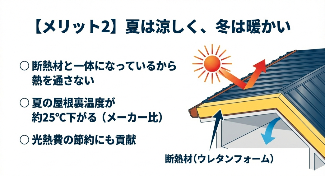 このウレタンフォームは熱を伝えにくい性質を持っており、屋根そのものが巨大な「パッシブ(受動的)な温熱バリア」として機能します。