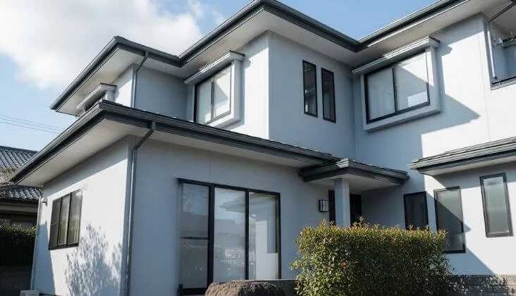 外壁塗装が完了した、美しくモダンな日本の住宅。高品質な仕上がりを伝えるプロフェッショナルな写真
