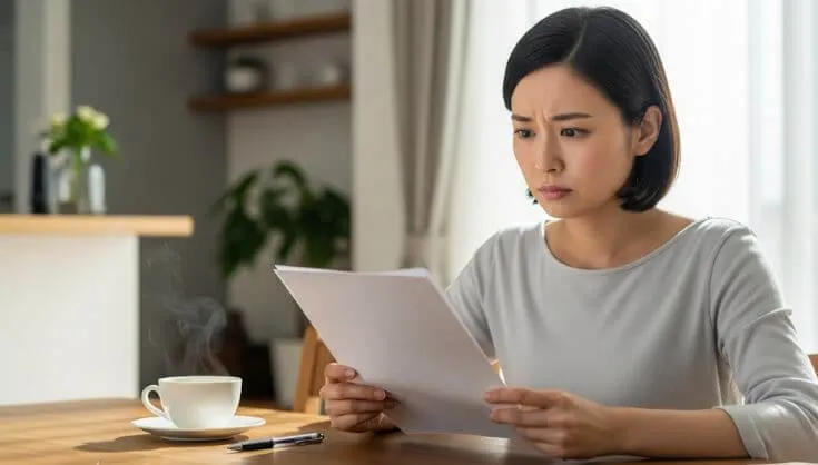 自宅のダイニングテーブルで見積書を前に、深く考え込んでいる人物