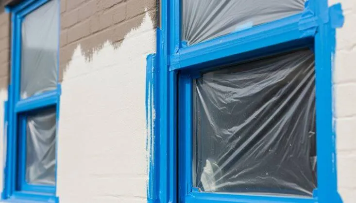 塗装工事の前に、窓のサッシが非常に丁寧にマスキングテープで養生されている様子