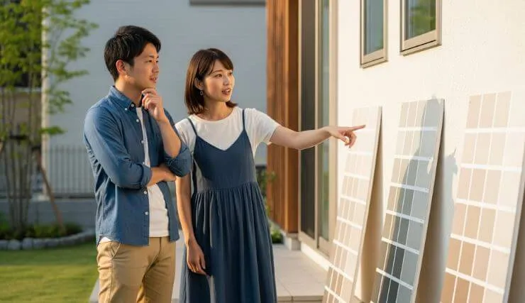 自宅の外壁に立てかけた複数の色見本を、少し離れた場所から夫婦が自然な様子で眺めている